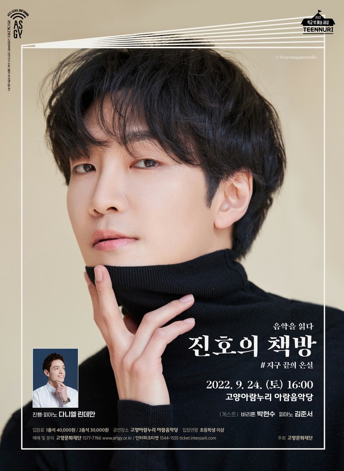 <진호의 책방>은 청소년들을 위한 고양문화재단 기획공연 시리즈 ‘학교 밖 예술세상 틴누리’의 2022년 마지막 프로그램이다. 고양문화재단은 앞서 같은 시리즈 프로그램으로 오케스트라로 듣는 이지 클래식 <쿨 썸머 청소년 음악회>와 렉처콘서트 <빈센트를 위하여-킬라만자로의 표범>을 선보인 바 있다.