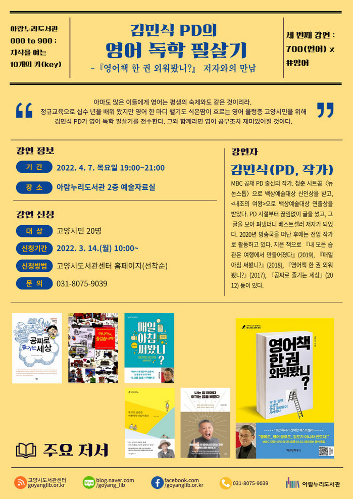 [부자동네타임즈 김인수기자] 고양시 아람누리도서관이 오는 4월 7일 목요일 오후 7시에 영어울렁증을 극복하고 싶은 고양시민을 독서문화프로그램 김민식 PD의 영어 독학 필살기에 초대한다.