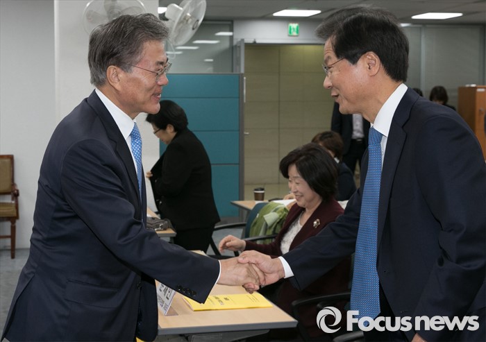 | △ 문재인(왼쪽) 새정치민주연합 대표와 천정배 무소속 의원이 28일 오전 서울 여의도 국회 의정관에서 열린 '역사교과서 국정화 저지 토론회'에 참석해 인사하고 있다. <사진제공=포커스뉴스> |