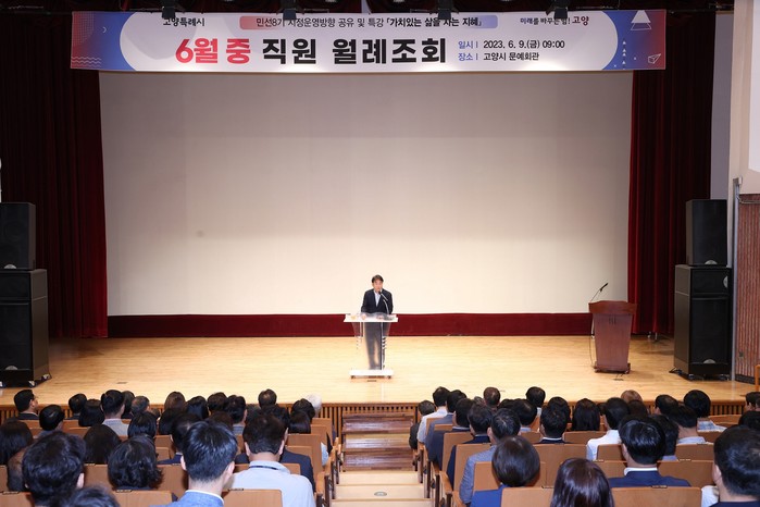 이동환 시장은 9일 시청 문예회관에서 6월 중 월례조회를 열고 “지난해 여름 시민들과 함께 민선8기의 문을 열었는데, 다음 달이면 벌써 민선8기 1주년을 맞는다”면서 “그동안 고양특례시의 새로운 미래를 위한 밑그림을 그려왔다면, 지금부터는 본격적인 변화가 시작되는 시기”라고 밝혔다.