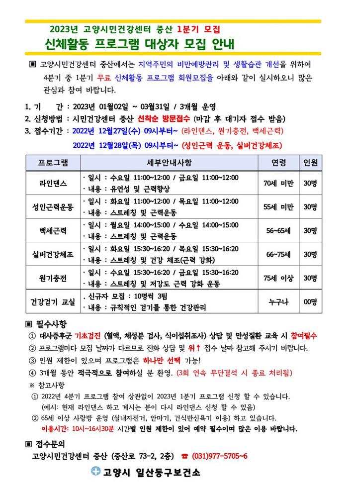 [부자동네타임즈 김인수기자] 고양특례시(시장 이동환) 일산동구보건소에서 운영하는 중산 고양시민건강센터에서 지역 주민의 건강증진을 위한 신체활동프로그램 참가자를 모집한다.