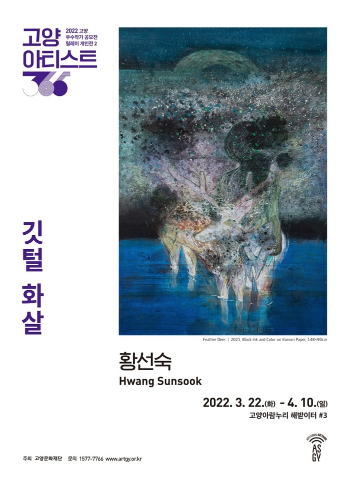 두 번째 릴레이 개인전 깃털 화살 展의 황선숙 작가는 동양학과 졸업 후 영상과 디지털 미디어를 전공하여 수묵화에 기반을 두되 다양한 변화를 꾀한 작업들을 선보이고 있다. 이번 개인전에서는 수묵이 보여줄 수 있는 다양한 세계와 내면을 구현하기 위해 자연의 비가시적이고 비합리적인 요소를 탐구하며 시간의 층위들을 표현하고자 한다. 대표 작품인 Feather Deer 속 사슴과 아이는 합리적으로 이해할 수 없는 개인적 경험의 형상이다. 신비한 자연의 생명과 치유의 존재이자 작가의 내면 속에 존재하는 무수한 타자(他者)들 중 하나를 형상화하여 펼쳐내었다.