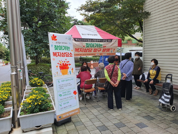 지난 9월 29일(수) 일산1동 동 관계자와 지역사회보장협의체 위원 및 해당 통장들은 지역 내 취약계층이 많이 거주하는 일산1동 동문1차 아파트 관리사무소 앞 공터에서 찾아가는 복지상담소를 설치하고 아파트 주변 주민들을 대상으로 상담 및 맞춤형복지 정보를 제공했다.