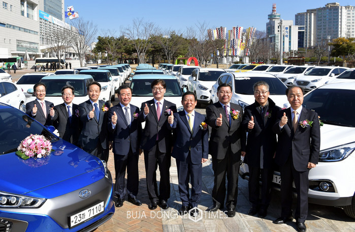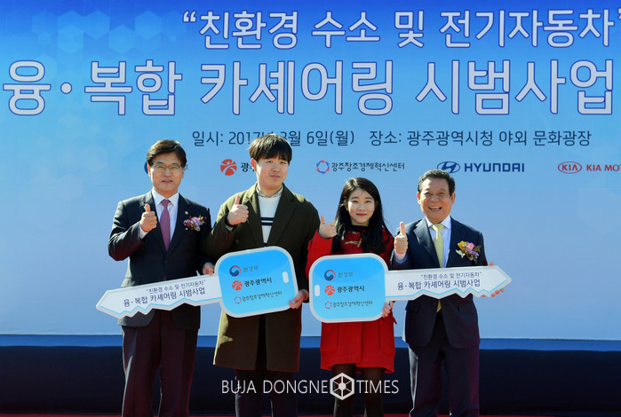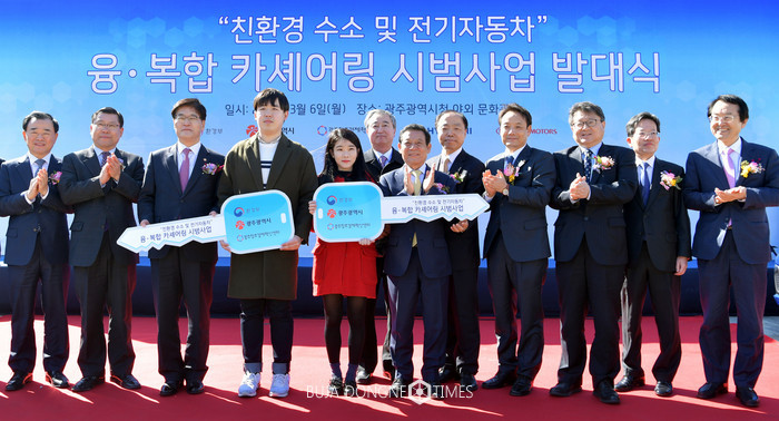 '친환경 수소 및 전기자동차 융·복합 카셰어링 시범사업' 발대식이 6일 오후 광주시청 앞 문화광장에서 열린 가운데 윤장현 광주광역시장, 조경규 환경부장관, 이은방 광주광역시회 의장, 박광식 현대자동차 부사장 등 내빈들이 수소차와 전기차를 배경으로 기념촬영을 했다.