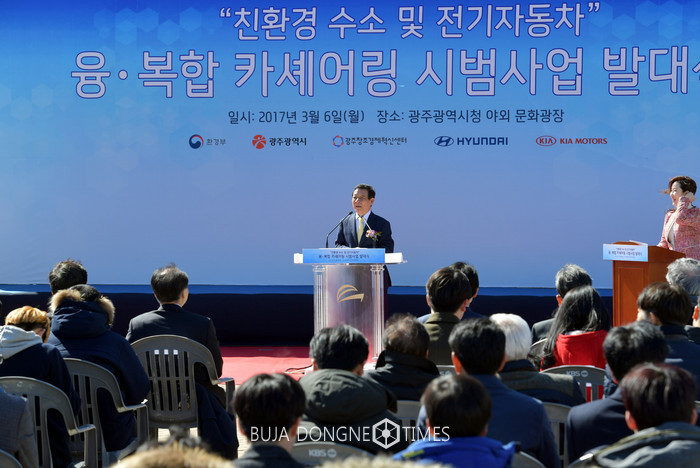 윤장현 광주광역시장이 6일 오후 광주시청 앞 문화광장에서 열린 '친환경 수소 및 전기자동차 융·복합 카셰어링 시범사업' 발대식에 참석해 인사말을 했다.