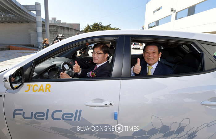 윤장현 광주광역시장과 조경규 환경부 장관이 6일 오후 광주시청 앞 문화광장에서 열린 '친환경 수소 및 전기자동차 융·복합 카셰어링 시범사업' 발대식에 참석해 수소차를 시승했다.
