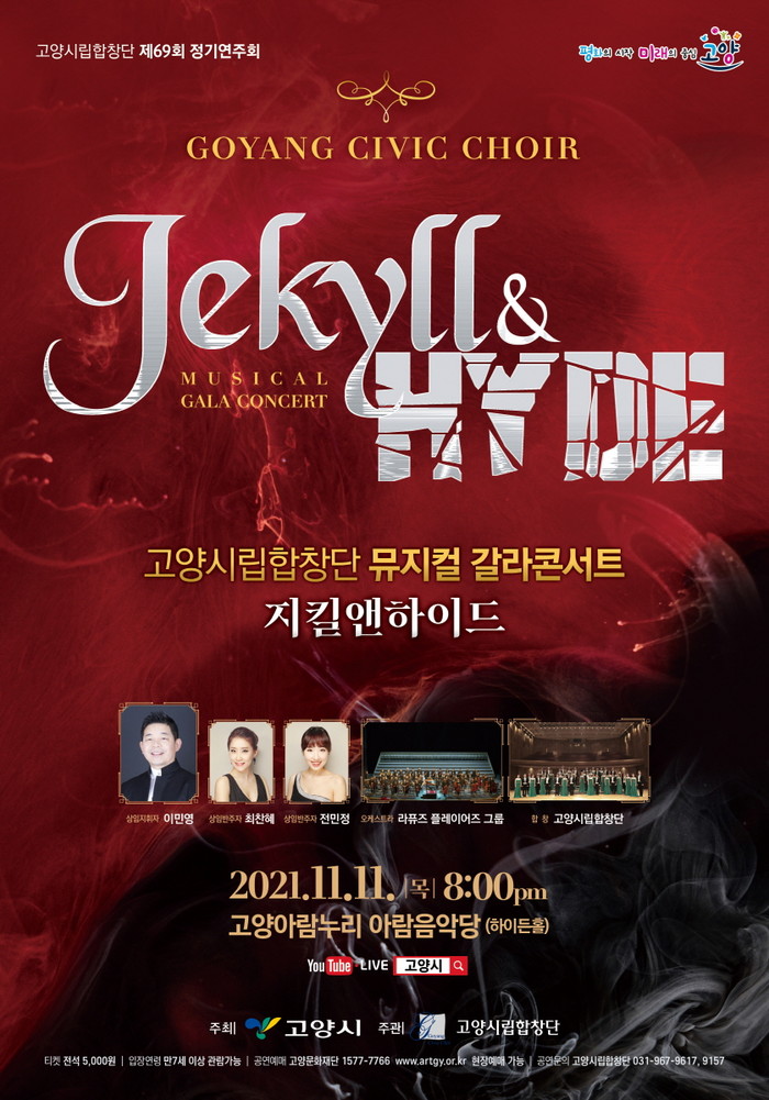 [부자동네타임즈 김인수기자] 고양시가 고양시립합창단의 제69회 정기연주회 뮤지컬 갈라 콘서트 지킬 앤 하이드를 오는 11월 11일(목) 오후 8시 고양아람누리 아람음악당(하이든홀)에서 개최한다.