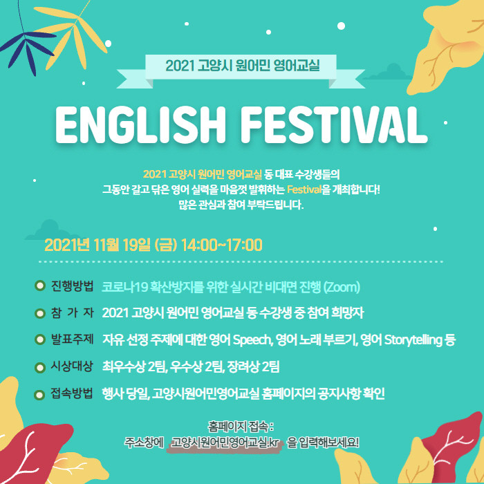 [부자동네타임즈 김인수기자] 고양시가 오는 11월 19일(금) 오후 2시에 ‘2021 고양시 원어민 영어교실 English Festival’을 비대면(ZOOM) 방식으로 개최한다.
