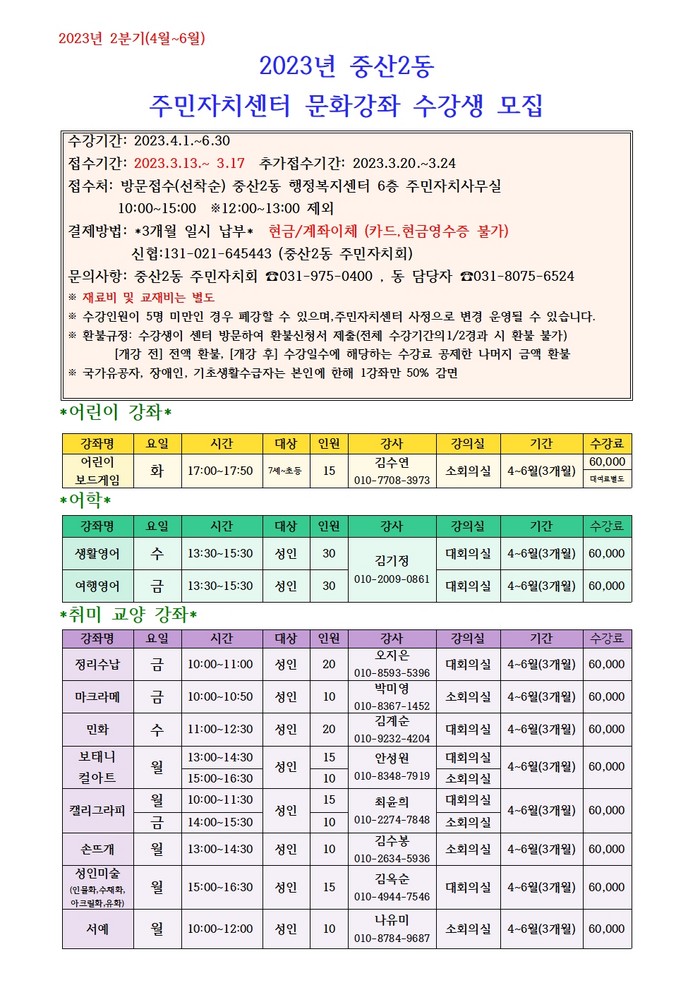 [부자동네타임즈 김인수기자] 고양특례시 중산2동 주민자치회는 3월 13일부터 17일까지 5일 동안 2023년 2분기(4월~6월) 주민자치센터 문화강좌 수강생을 모집한다.