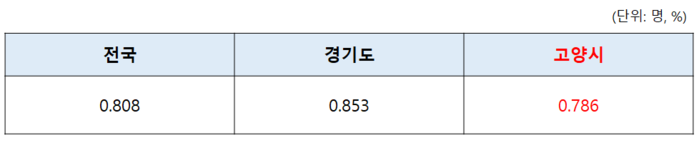 한편 고양시의 합계출산율은 0.786명으로, 인구 감소를 겪고 있는 전국 평균 0.808보다도 더 낮은 수치를 기록하고 있다.