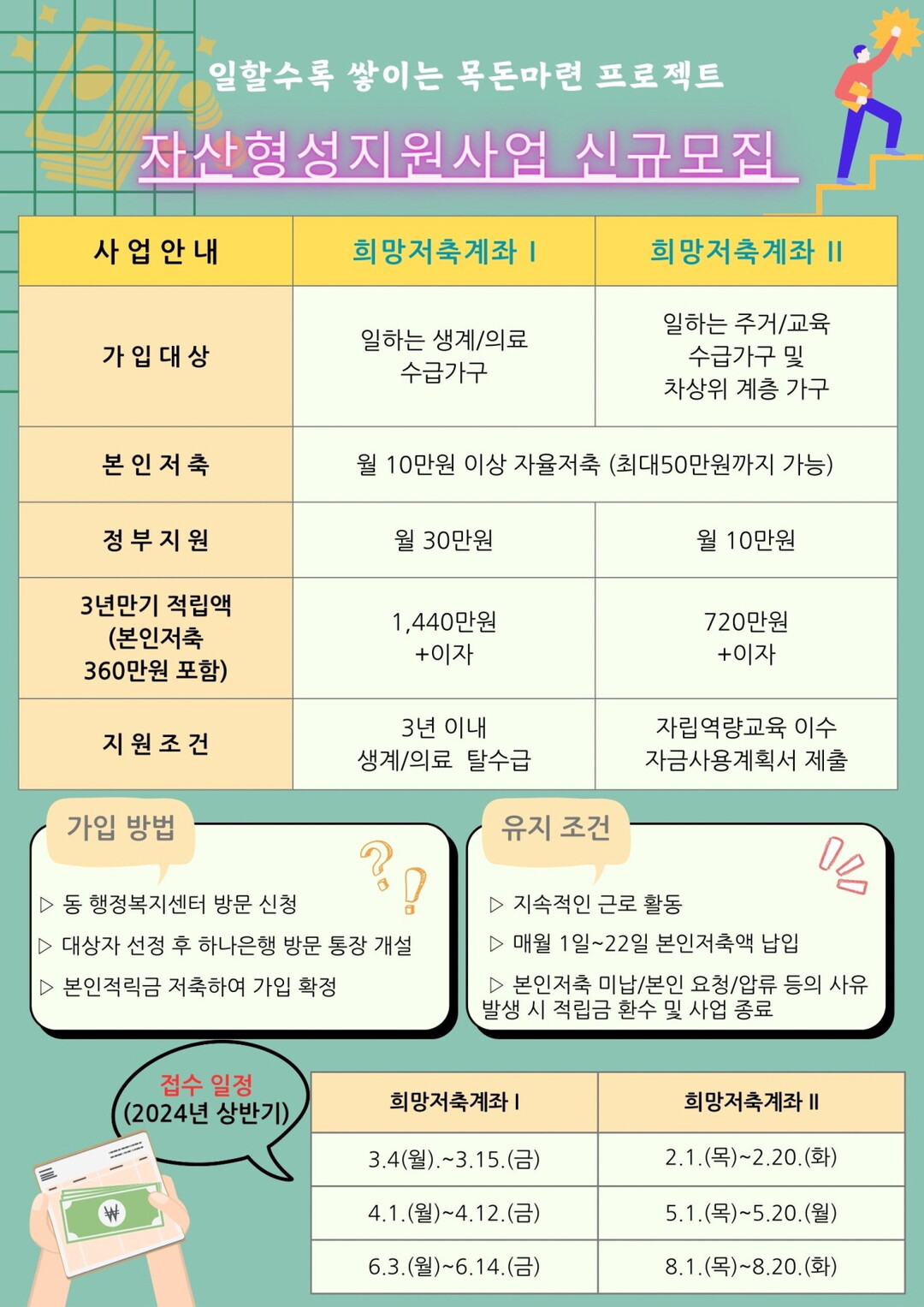 희망저축계좌Ⅰ은 가구별 소득기준을 충족하는 일하는 생계‧의료수급 가구를 대상으로 3년간 매월 10만원(최대 50만원) 저축 및 3년 이내 탈(脫)수급 시 근로소득장려금1,080만원(월 30만원 적립)을 지원하는 사업이다.