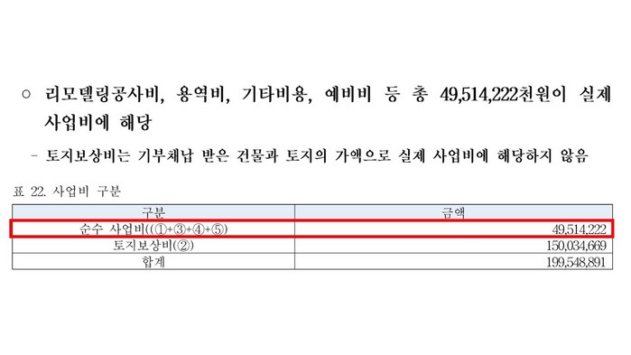 또한, 시는 지난 19일 개최됐던 건설교통위원회 행정사무감사에서도 총사업비 1,995억원에 대해 “타당성 조사 시에는 공유재산 즉 토지 및 건물가액을 포함하여 총사업비를 작성하기에 부득이 공유재산 가격을 넣은 것이고 실제 투입되는 예산은 495억원이 전부”라고 답변한 바 있다.
