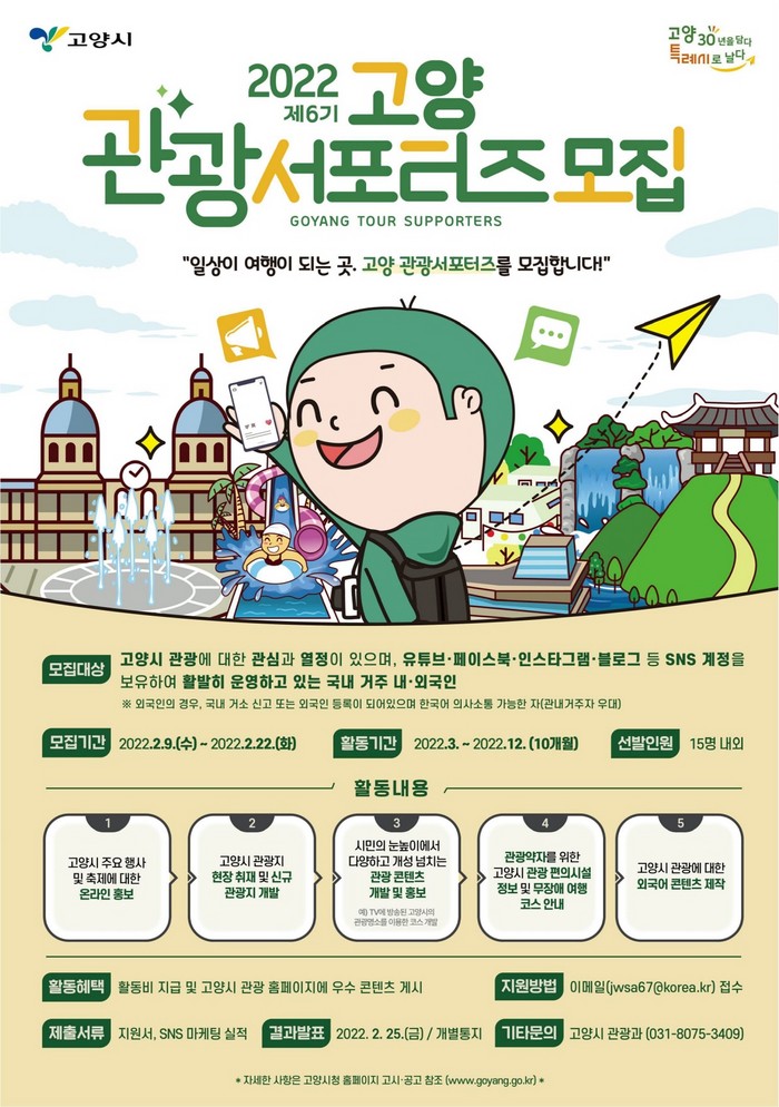 [부자동네타임즈 김인수기자] 고양시는 관내 관광지와 축제 등을 사회관계망서비스(SNS)로 홍보하기 위한‘제6기 고양 관광서포터즈’를 2월 9일부터 2월 22일까지 공개 모집한다.