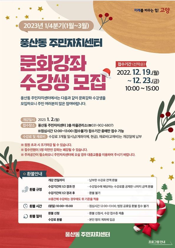 풍산동 주민자치센터 문화강좌 프로그램 접수는 12월 19일부터 12월 23일까지 매일 오전 10시부터 오후 3시까지(12시~1시 제외) 풍산동 주민 자치센터 2층 마을관리소에서 진행되며, 자세한 내용은 고양시청 홈페이지 내 풍산동 페이지에서 확인 가능하다.