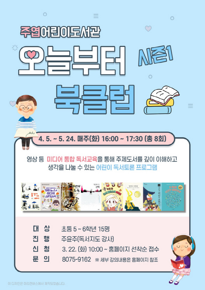 오늘부터 북클럽은 지난해 어린이들과 학부모로부터 큰 호응을 얻은 주엽어린이도서관의 인기 프로그램이다. 시즌 1은 영상 등 미디어 통합 독서교육으로 주윤주 독서지도 강사가 진행할 예정이다.