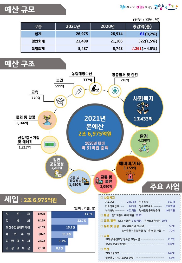 [부자동네타임즈 김인수기자] 고양시(시장 이재준)가 2021년 예산(안)을 확정하고 고양시의회 제2차 정례회에 제출했다. 내년도 예산안은 총 2조 6,975억 원으로 올해 대비 0.2% 소폭 증가했다.