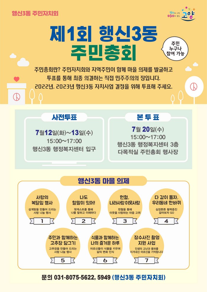주민총회는 주민자치회를 중심으로 주민이 직접 발굴한 마을 제안사업의 우선순위를 투표로 결정하는 행사로서 주민 누구나 참여할 수 있다. 올해 첫 회를 맞는 행신3동 주민총회는 주민의 참여도 제고를 위해 주민총회에 앞서 사전투표를 시행한다.