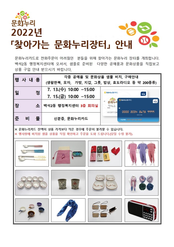 [부자동네타임즈 김인수기자] 고양특례시 백석2동 행정복지센터에서는 7월 13일과 15일 오전 10시부터 오후3시까지 ‘찾아가는 문화누리장터’를 개최한다.