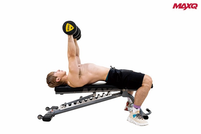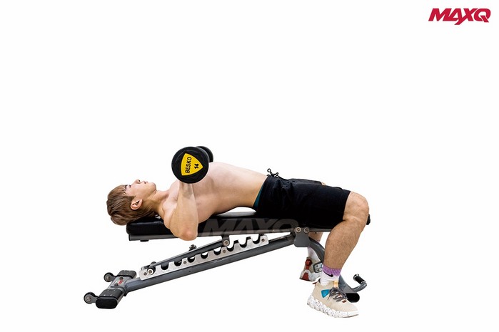 플랫밴치에 누운 상태에서 덤벨을 가슴위치에 옮겨준다. 지면쪽으로 천천히 가슴을 통제시키며 내려주고 주먹을 한 번더 움켜쥐고 천장을 향해 밀어준다.