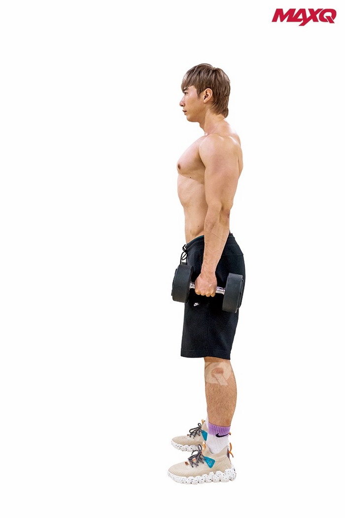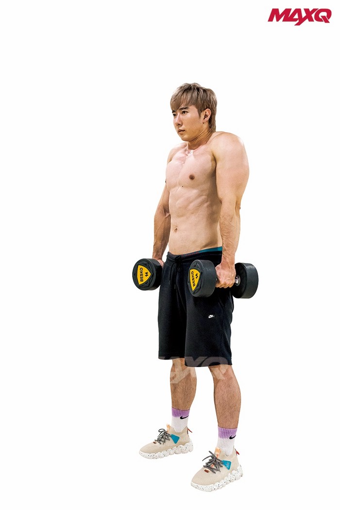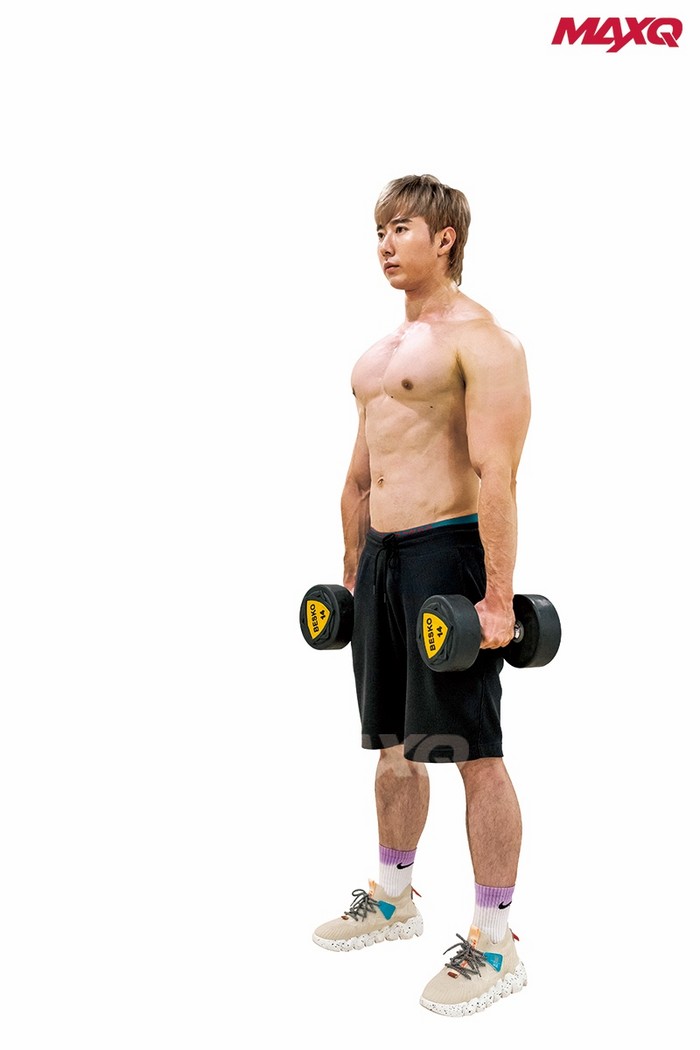 덤벨을 몸통에 가깝게 가져오고 승모근을 천천히 하늘 위로 당겨준다. 천천히 통제시키며 내려 놓는다.