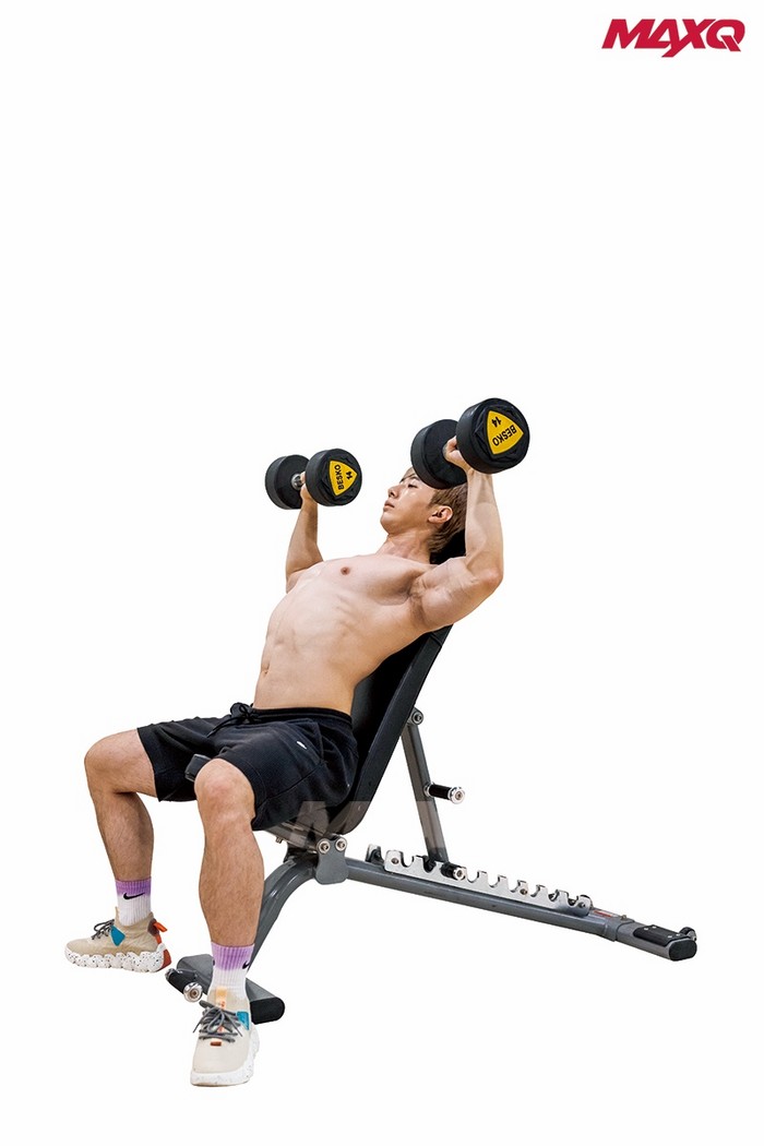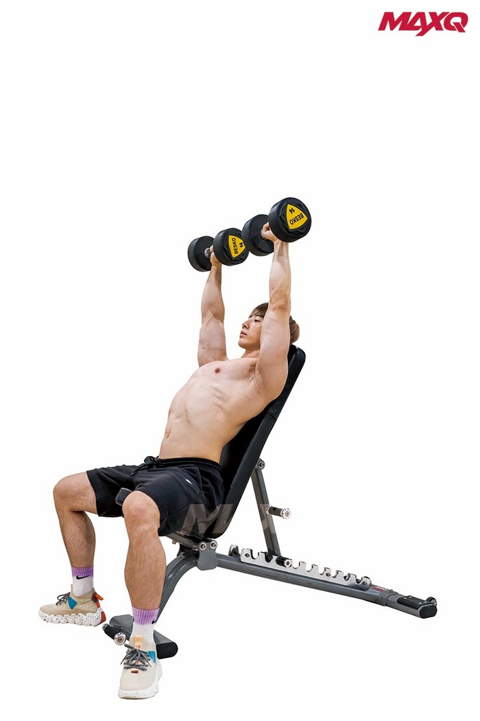 발바닥은 지면에 닿아 덤벨을 하늘을 향해 밀어준다. 천천히 원위치 시킨다.