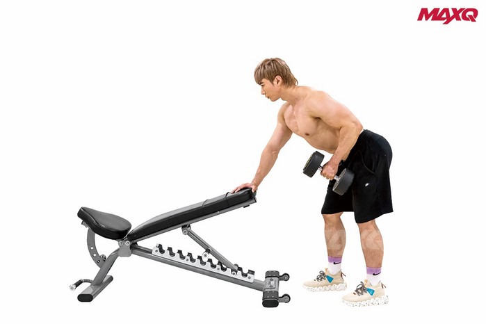 덤벨을 몸통 가깝게 가져오고 앞으로 기울여준다. 이때 허리는 아치형을 만들어주되 과도한 아치는 부담을 줄 수 있으므로 주의한다. 무릎까지 덤벨이 내려왔으면 원위치.
