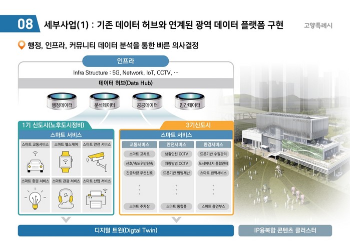 고양시는 경기북부 유일 지역거점 스마트시티 조성을 위해 ▲다양한 정책에 활용할 수 있는 스마트도시 플랫폼 구현 ▲도시의 미래 모습을 3차원 디지털 트윈으로 제공 ▲ChatGPT 기반의 AI행정서비스 ▲지역산업과 연계한 다양한 서비스 제공 ▲데이터에 기반한 최첨단 교통분석시스템 구현 ▲스마트시티 이노베이션 센터 운영 등을 추진한다는 계획이다.