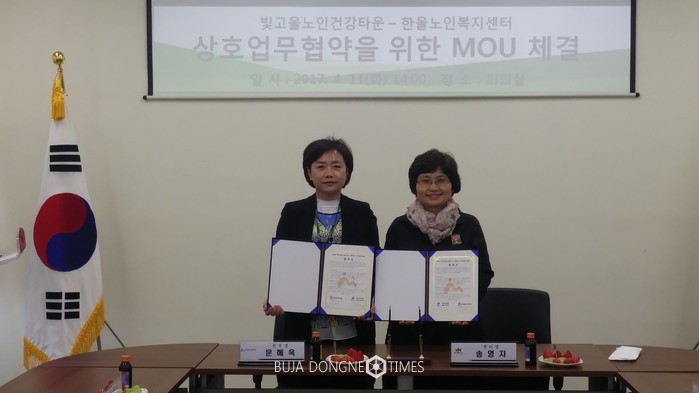 광주복지재단(대표 장현) 빛고을노인건강타운은 11일 오후 2시 타운 회의실에서 한울노인복지센터(센터장 송영자)와 지역사회를 기반으로 필요한 서비스를 제공하는 업무협약 체결했다.