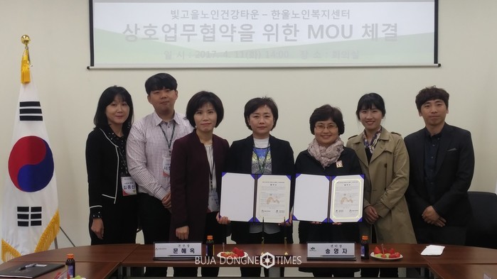 | △광주복지재단 빛고을노인건강타운은 한울노인복지센터와 지역사회를 기반으로 필요한 서비스를 제공하는 업무협약 체결했다 |