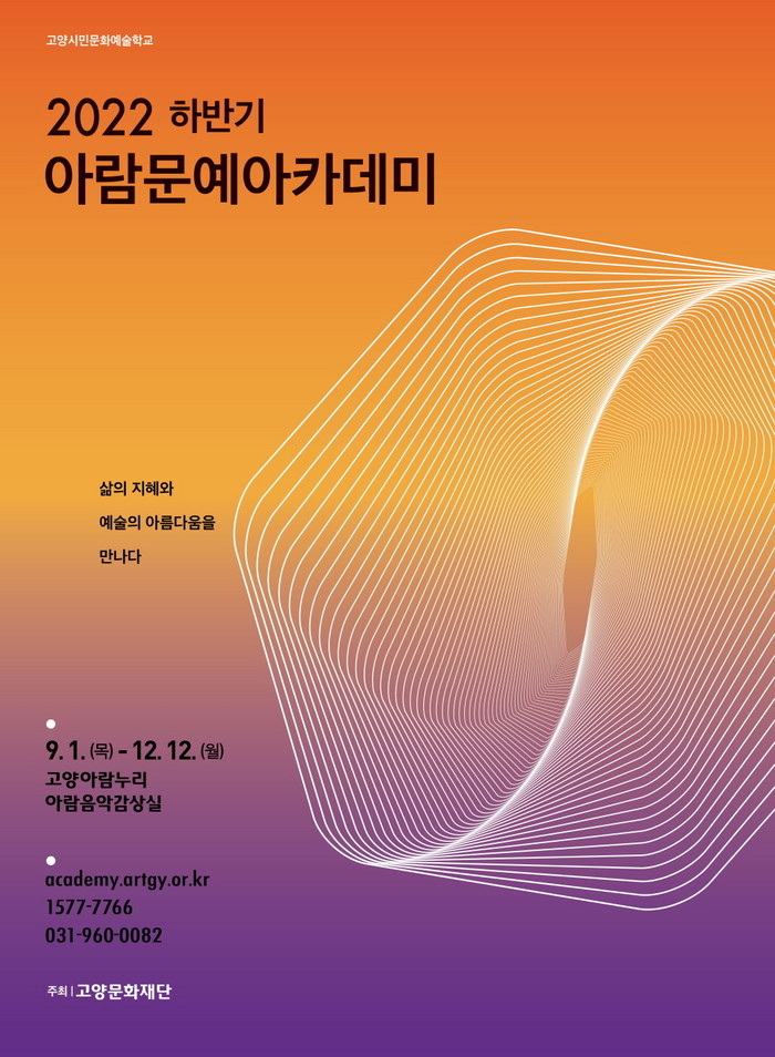 12회차로 이루어진 <2022 하반기 아람문예아카데미> 정규 프로그램의 수강료는 160,000~180,000원이며, 미니특강의 수강료는 45,000원이다. 7월 25일 월요일부터 온라인과 현장에서 수강신청 접수를 받고 있다. 세부 커리큘럼 등 보다 자세한 사항은 고양문화재단 누리집과 아람문예아카데미을 통해 확인할 수 있다.