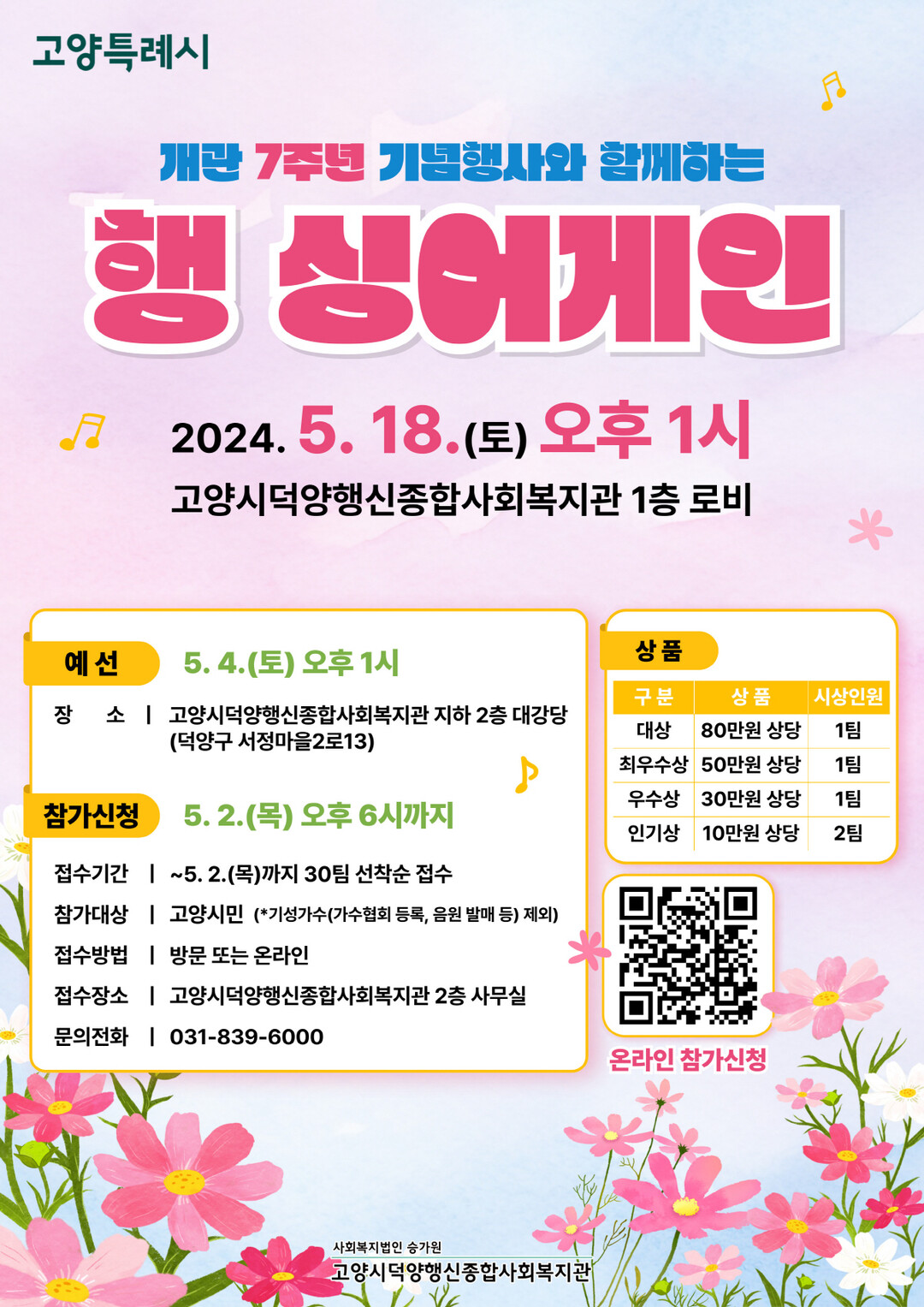 참가자 예선은 5월 4일(토) 고양시덕양행신종합사회복지관에서 열리며, 예선을 통해 본선 진출자 5팀을 선발한다. 본선은 5월 18일(토), 복지관 개관 7주년 기념행사와 함께 진행된다.