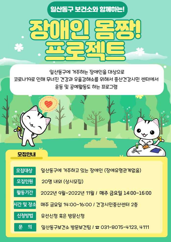 [부자동네타임즈 김인수기자] 고양특례시(시장 이동환) 일산동구보건소가 장애인 건강증진을 위해 2022년 장애인 재활·운동 프로그램 ‘장애인 몸짱! 만들기 프로젝트’ 신규 대상자를 모집한다.