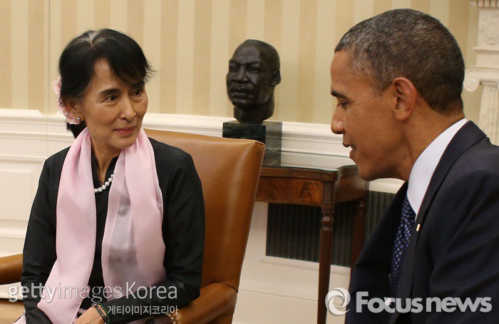 | △ 지난 2012년 10월 버락 오바마 미국 대통령과 아웅산 수치 여사가 미국 워싱턴에서 만나고 있다. 아웅산 수치 여사는 미국, 영국 국가와 친밀한 관계를 유지해왔다. ⓒ게티이미지/멀티비츠 photo@focus.kr |