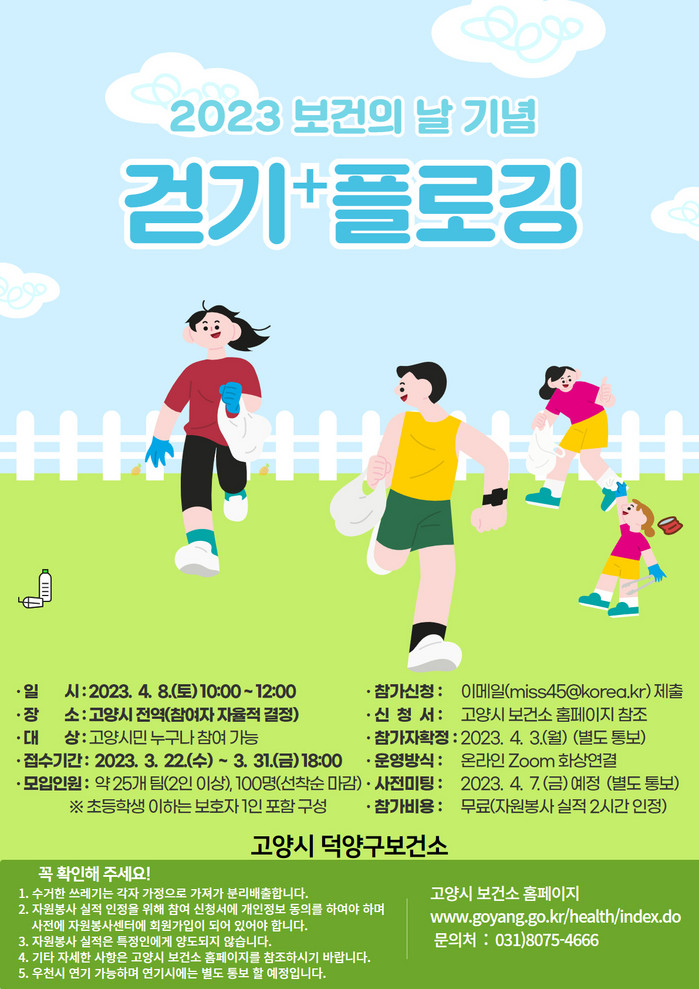 [부자동네타임즈 김인수기자] 덕양구보건소에서 4월 7일 제51회 보건의 날을 기념해 플로깅(달리면서 쓰레기를 줍는 운동) 행사를 개최한다.