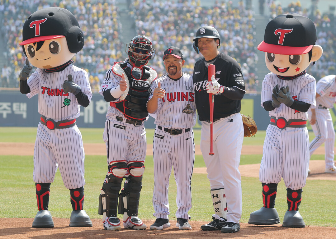 [부자동네타임즈 = 이언금 기자] 프로야구 정규시즌 개막일인 28일 서울 잠실야구장에서 열린 KT 위즈와 LG 트윈스의 경기에서 LG 김용일 수석트레이닝 코치가 시구를 마친 뒤 박동원, KT 김현수와 기념촬영을 하고 있다. 2026.3.28