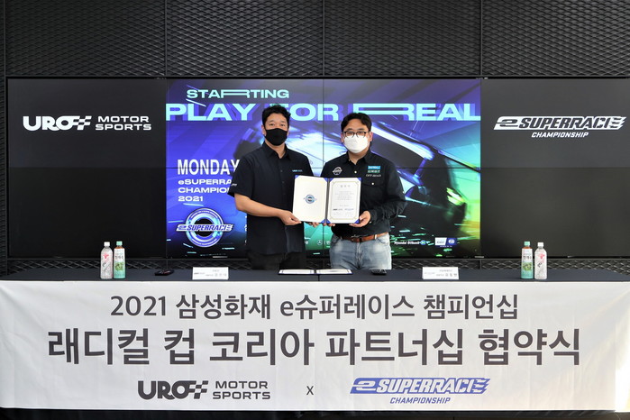 [부자동네타임즈 김인수기자] 슈퍼레이스 챔피언십을 주관하는 ㈜슈퍼레이스가 ‘래디컬 컵 코리아’ 클래스 오거나이져 유로모터스포츠와 ‘2021 삼성화재 e슈퍼레이스 챔피언십’의 파트너십 협약을 맺었다. 김동빈 슈퍼레이스 대표와 김진태 유로모터스포츠 대표는 5일(금) 오후 ‘2021 CJ대한통운 슈퍼레이스 챔피언십’ 5, 6라운드가 열리고 있는 에버랜드 스피드웨이에서 만나 슈퍼레이스가 주관하는 디지털 모터스포츠 ‘2021 삼성화재 e슈퍼레이스 챔피언십’의 발전을 위해 함께 힘을 모으기로 약속했다.