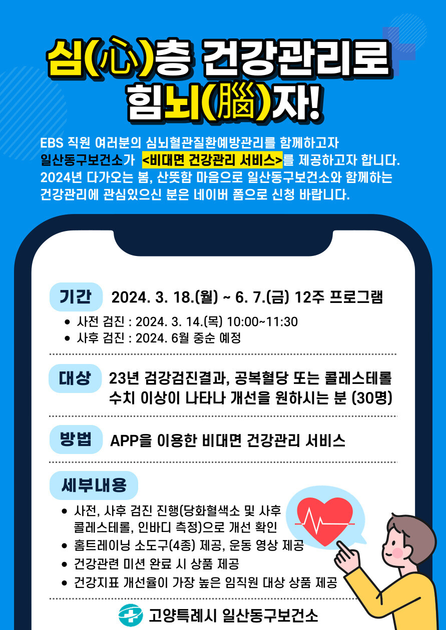 한편, 모바일을 활용한 직장인 대상 비대면 심뇌혈관질환예방 관리 사업 관련 문의는 일산동구보건소 건강증진팀(☎031-8075-4149)으로 하면 된다.