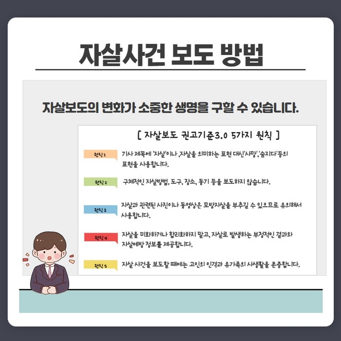 권고기준에 따르면 기사 제목에 ‘자살’이나 자살을 암시하는 표현 대신 ‘사망’, ‘숨지다’ 등과 같이 객관적 사망 사실에 초점을 둔 표현을 사용해야 한다. 구체적인 자살 방법이나 도구, 장소 등을 보도하는 것도 피해야 한다.