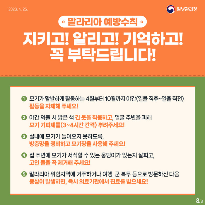국내외 말라리아 위험 지역 및 예방약 정보, 예방수칙은 질병관리청 홈페이지에서 확인할 수 있다.