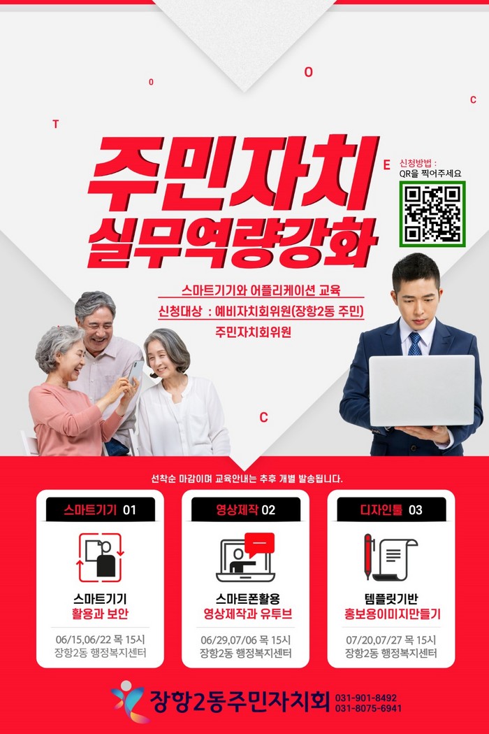 ‘자치역량 강화교육’은 6월 15일 목요일을 시작으로, 매주 목요일 15시마다 총 6회에 걸쳐 진행된다. ▲ 6월 15일, 22일에 스마트기기(활용과 보안) ▲ 6월 29일, 7월 6일에 스마트폰활용(영상제작과 유튜브) ▲ 7월 20일, 27일에 템플릿을 기반으로 하는 홍보용 이미지 만들기를 주제로 진행된다.