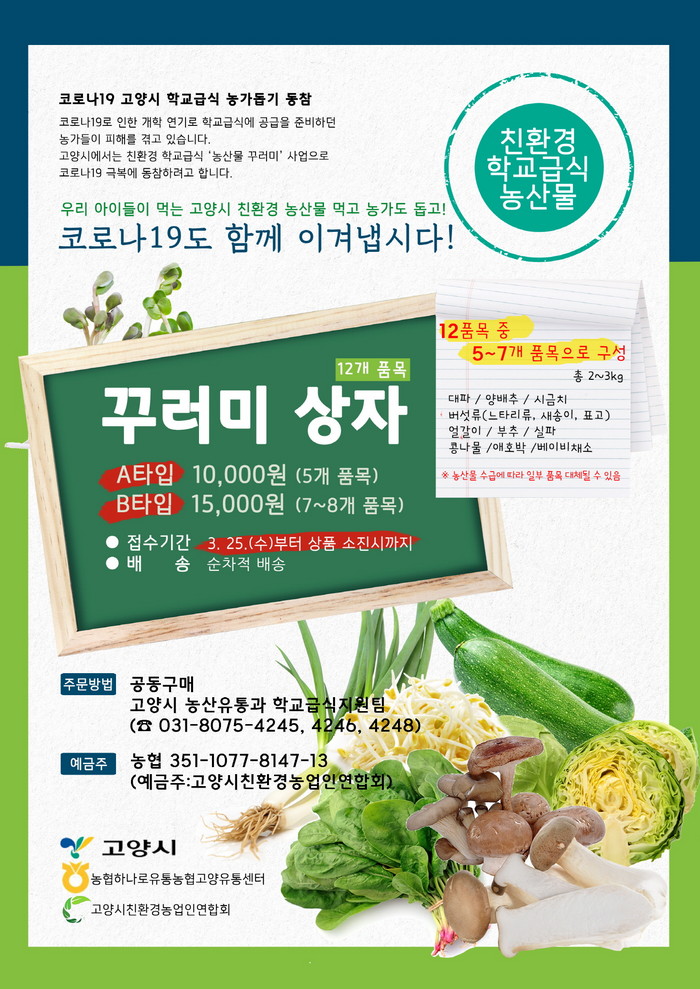 이외에도 시에서는 고양시청과 3개 구청, 고양교육지원청, 유관 기관들에게 농산물 공동구매를 협조 요청하는 ‘자발적 농가 돕기 동참’도 계획했다. 오는 27일까지 관계 기관 직원들을 대상으로 예약 접수를 마칠 예정이다.
