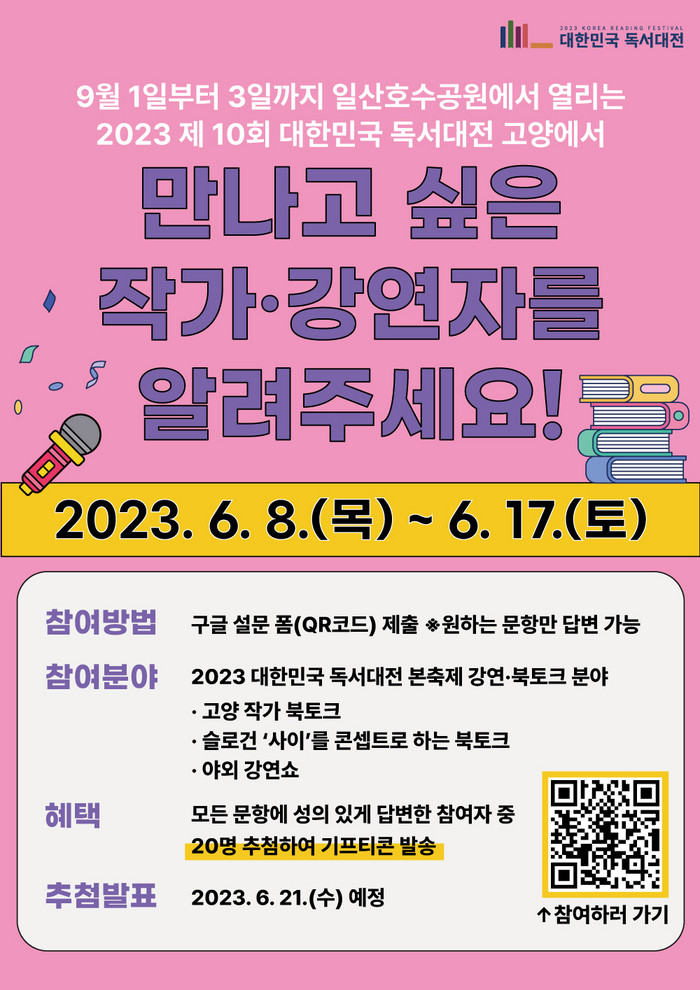 [부자동네타임즈 김인수기자] ‘2023 대한민국 독서대전’을 국민이 함께 만들어 가는 축제로 구성하기 위해 6월 8일부터 6월 17일까지 10일간 ‘강연·북토크 분야 설문조사’를 실시한다.