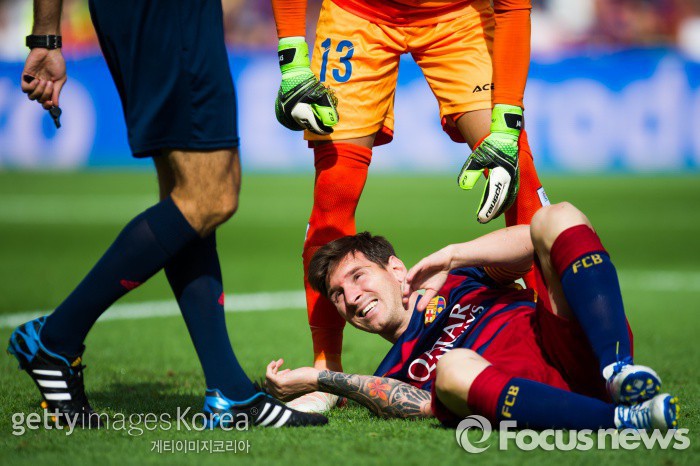 | △ <바르셀로나/스페인=게티/포커스뉴스> 바르셀로나 리오넬 메시가 9월26일 오후(한국시간) 홈에서 열린 라스 말파스와의 프리메라리가 경기 도중 부상을 당해 그라운드에 쓰러져 고통을 호소하고 있다. (C)게티이미지/멀티비츠 |
