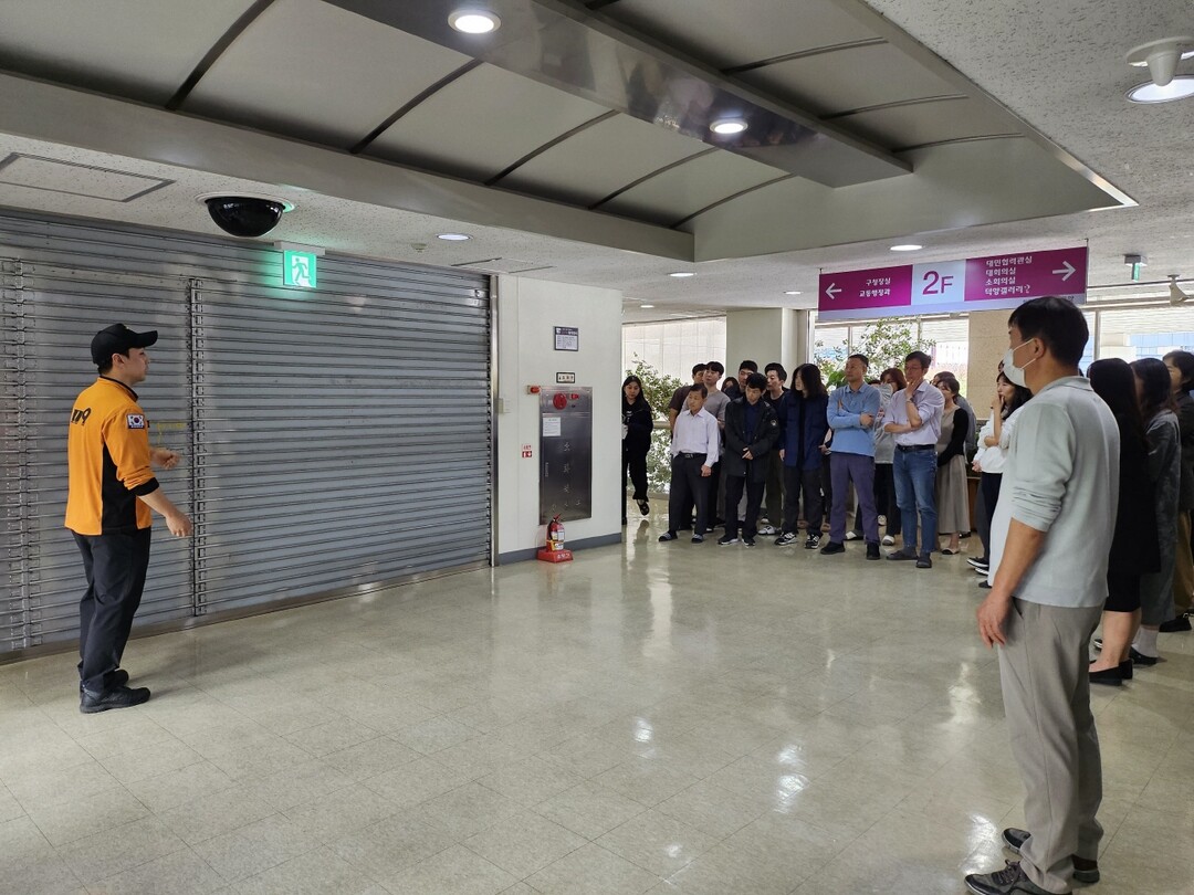 이날은 청사 5층에서 화재가 발생한 가상의 상황을 부여해 화재 경보 발령, 소방서 신고 및 각층 화재 전파를 통해 소화통보훈련을 실시했다.