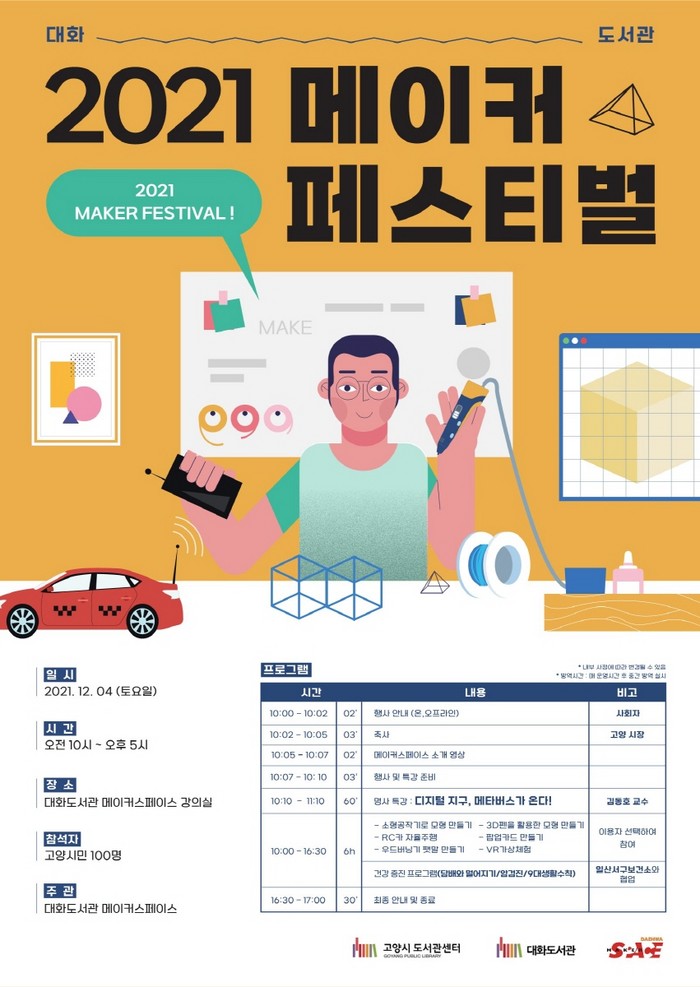 [부자동네타임즈 김인수기자] 고양시 도서관센터가 ‘가족과 함께하는 메이커 체험’을 주제로 오는 12월 4일 대화도서관에서 ‘2021 대화도서관 메이커 페스티벌’을 개최한다.