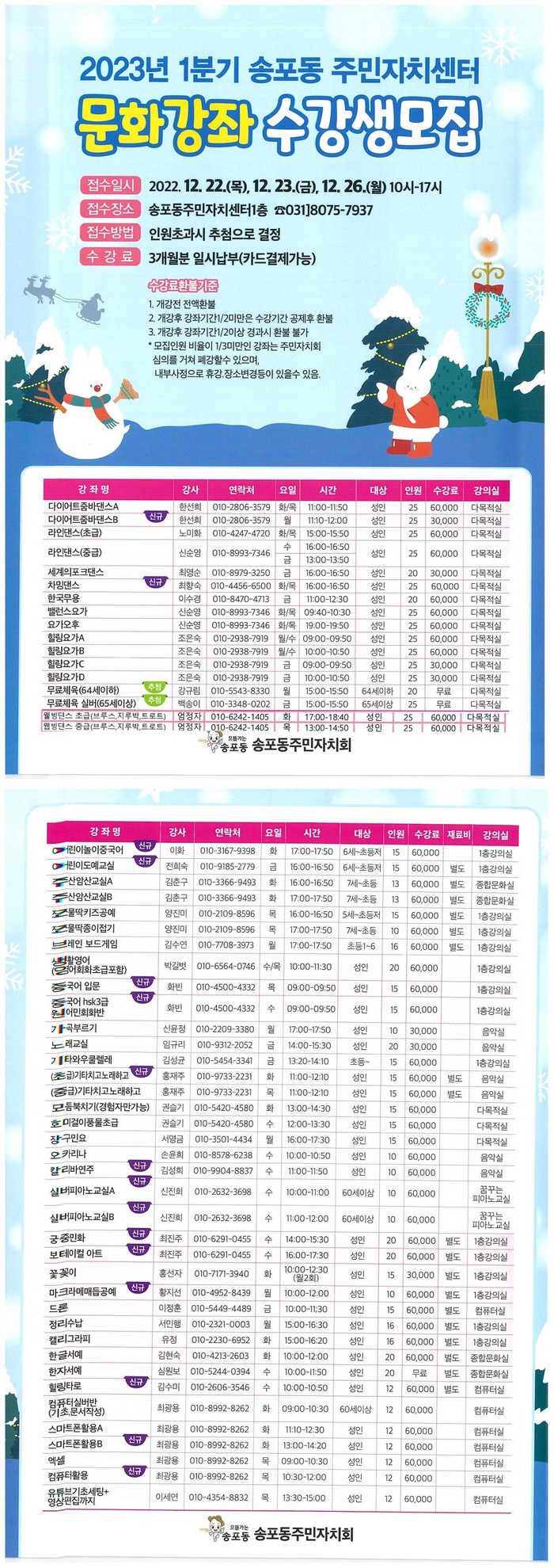 [부자동네타임즈 김인수기자] 고양특례시 일산서구 송포동 주민자치회는 12월 19일부터 2023년 1분기(1~3월) 주민자치센터 문화강좌 신규 수강생을 모집한다.