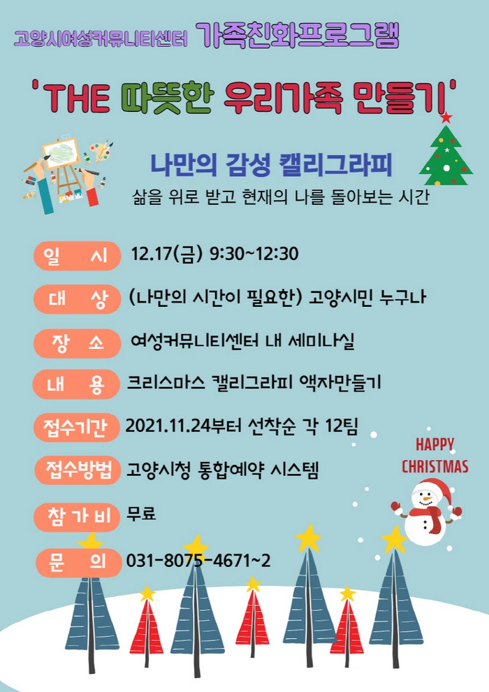 [부자동네타임즈 김인수기자] 고양시 여성커뮤니티센터가 오는 12월 15일 가족친화 프로그램 나만의 감성 캘리그라피를 운영한다.