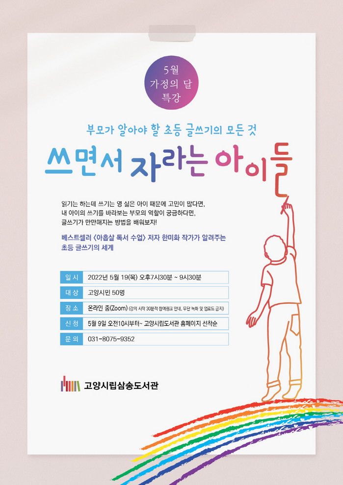 ‘쓰면서 배우는 아이들’은 온라인(Zoom)으로 진행된다. 고양시민 50명을 대상으로 5월 19일 목요일 오후7시 30분부터 약 2시간가량 수업을 진행한다.