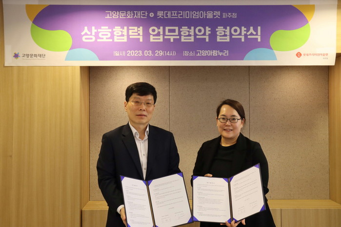 [부자동네타임즈 김인수기자] 고양시의 핵심 문화기지로 역할하고 있는 고양문화재단과 국내 대표 쇼핑몰 롯데프리미엄아울렛 파주점은 지난 3월 29일, 고양시 일산동구에 위치한 고양아람누리에서 상호협력 및 발전을 위한 업무협약을 체결했다.