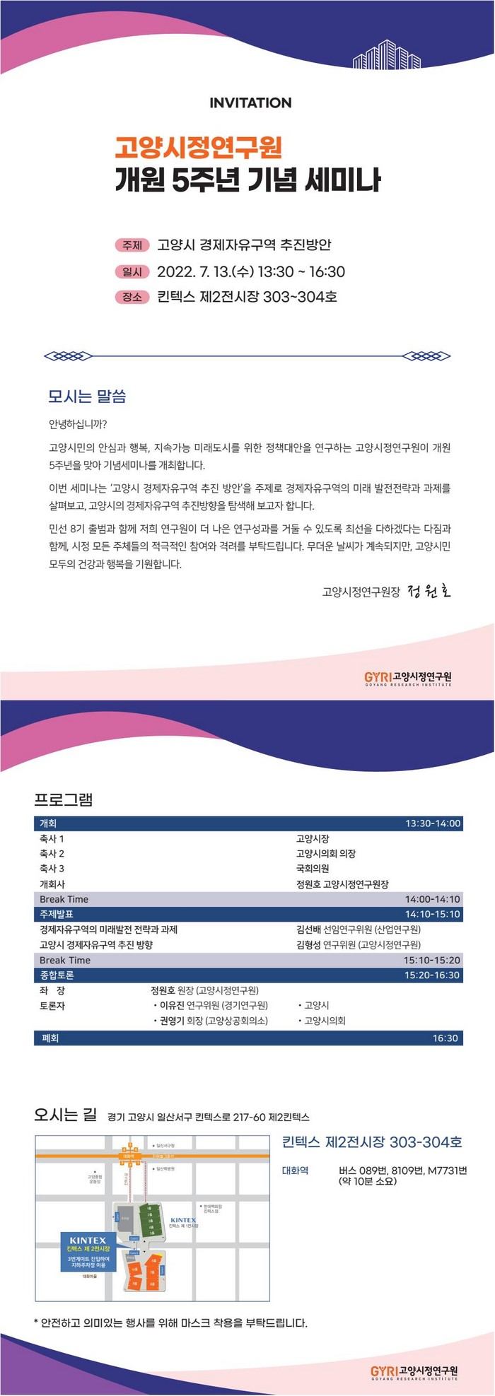 정원호 고양시정연구원장은 “경제특례시 고양을 위한 첫 걸음인 고양시 경제자유구역 추진 방안을 함께 고민해보고자 자리를 마련했다”며, “세미나에서 제시된 방안과 논의된 의견들을 통해 고양시 경제자유구역 지정 추진을 발판을 마련하기 바란다”고 전했다.